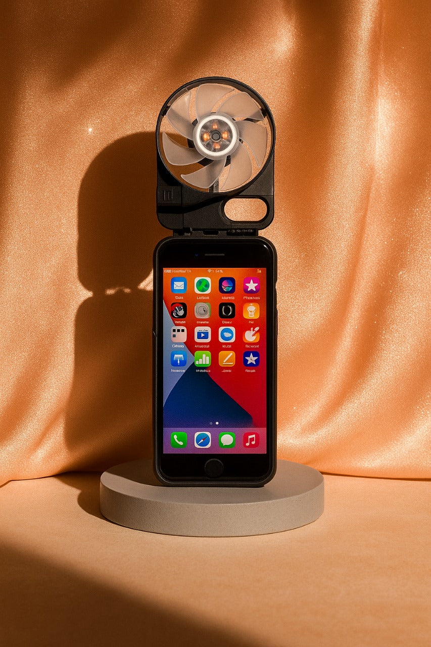 The fan component is a separate unit that attaches to the smartphone case. The fan unit rotates about a pivot joint making its position adjustable. The fan unit can either fold flat against the smartphone case for storage, or be placed at a variety of angles/positions for optimum use of the fan. The fan unit has rotary spinning blades powered by a motor which when activated provides a cooling draft for the user. The power source for the motor is the Smartphone battery. The fan unit connects to the Smartphone outlet port via USB cable and receives power in this manner. The proposed optimum angle/position of the fan relative to the smartphone for handheld use is 180 degrees. The proposed optimum angle/position of the fan relative to the smartphone for tabletop use is 135 degrees. However the fan is fully adjustable through a range of angles and the user may select the angle they deem most appropriate.The invention casing may be formed of polyurethane, polycarbonate, silicone, metal or any other variations known in the art.